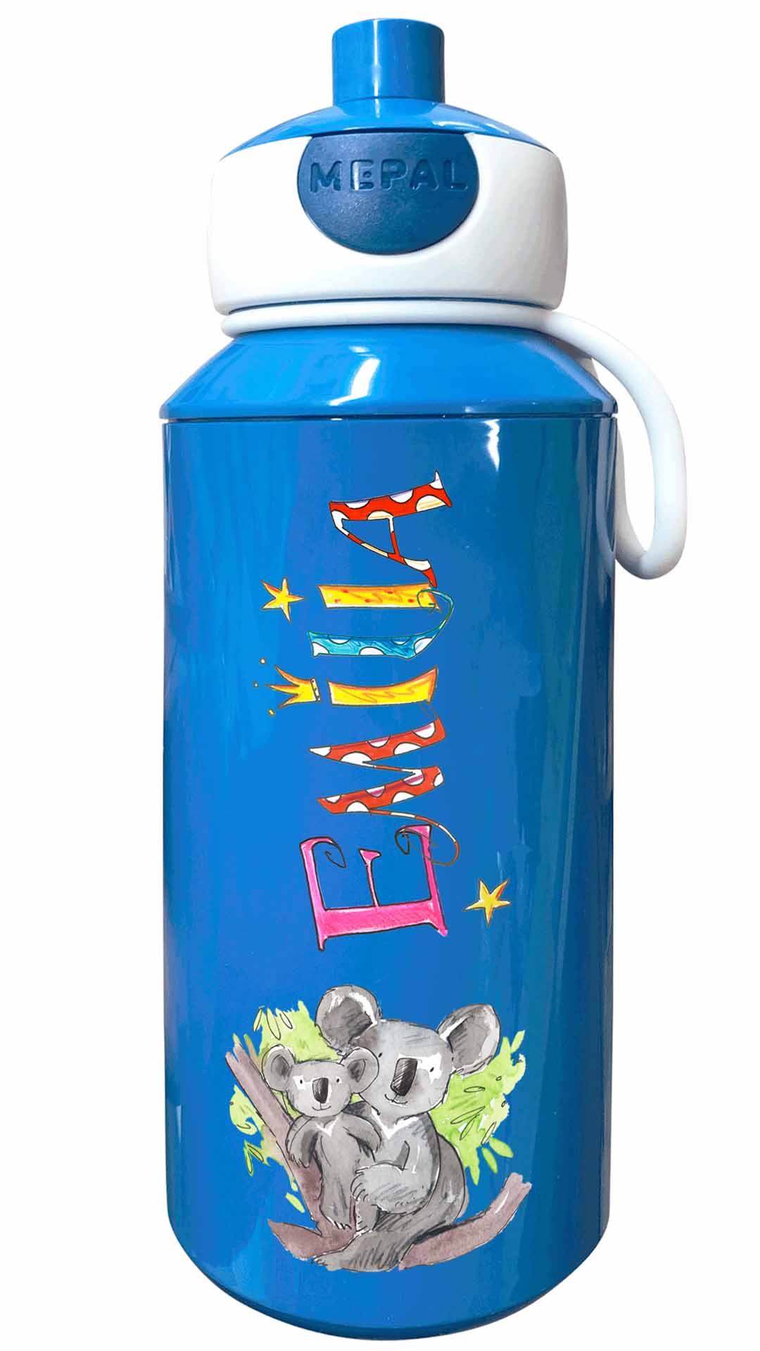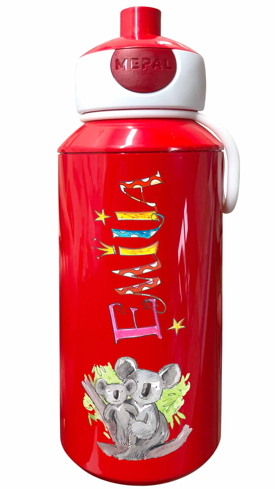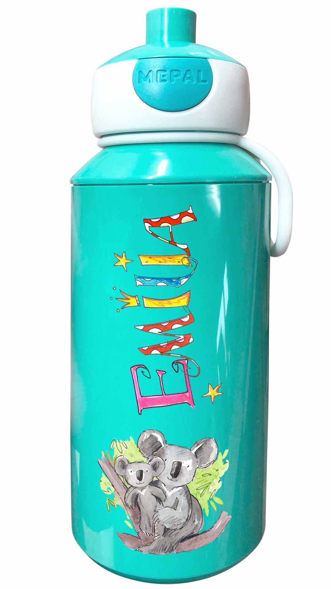 Durch die illustrierten Namen und den lustigen Motiven werden die Brotdosen mit Namen zu tollen handgemachten Unikaten. Die Trinkflasche Mepal Popup mit lustig bunten illustriertem Namen lässt sich öffnen den Knopf zu drücken und schließt lustigerweise dadurch den Trinkstutzen wieder reinzudrücken.